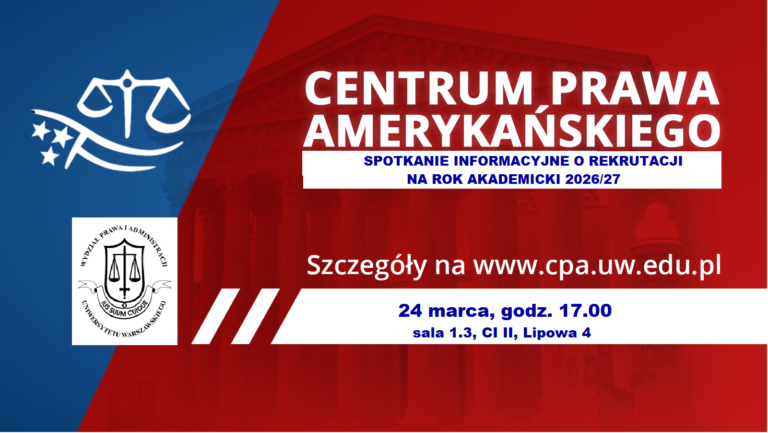 Zapraszamy wszystkie osoby zainteresowane rekrutacją do Centrum Prawa Amerykańskiego na Wydziale Prawa i Administracji Uniwersytetu Warszawskiego w roku akademickim 2026/27 na